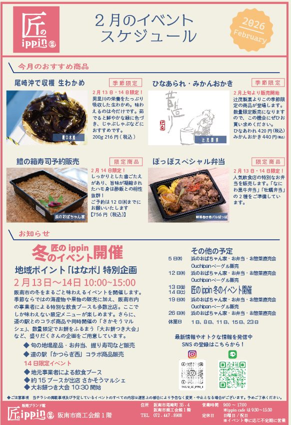 匠のippin 2月スケジュール 2026 2/06 お知らせ 匠のippin 是非、お気軽にお立ち寄り下さい! お知らせ 匠のippin 年末年始の営業日 お知らせ 得するまちのゼミナール 2月開催!